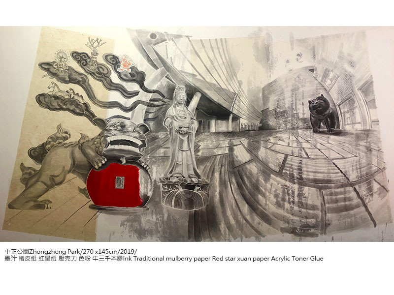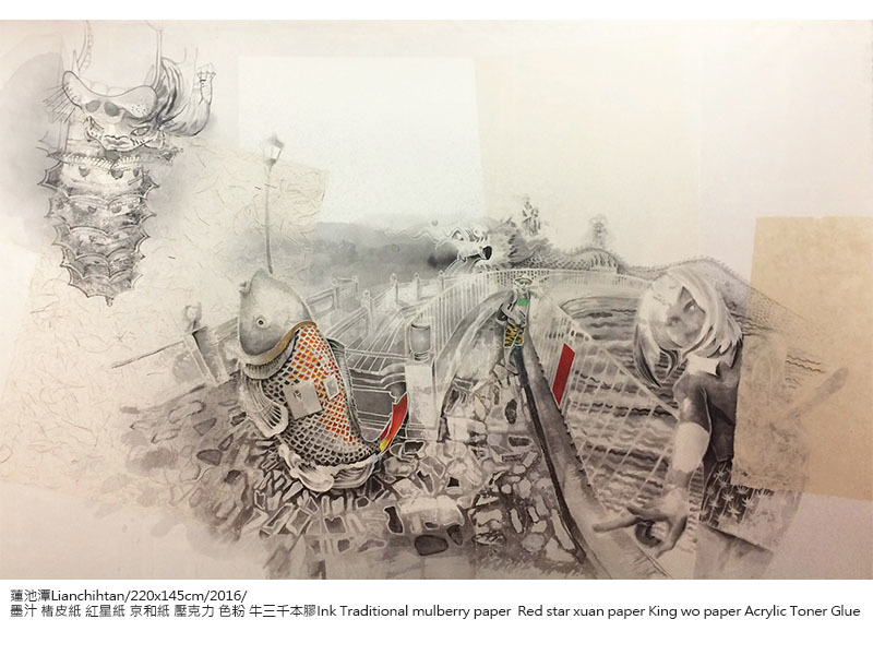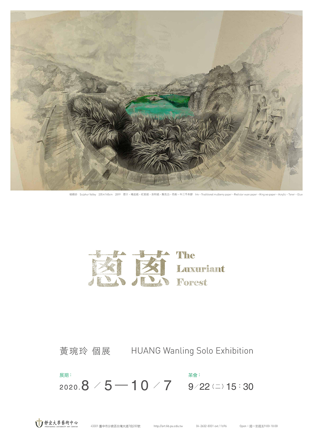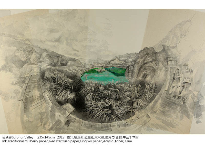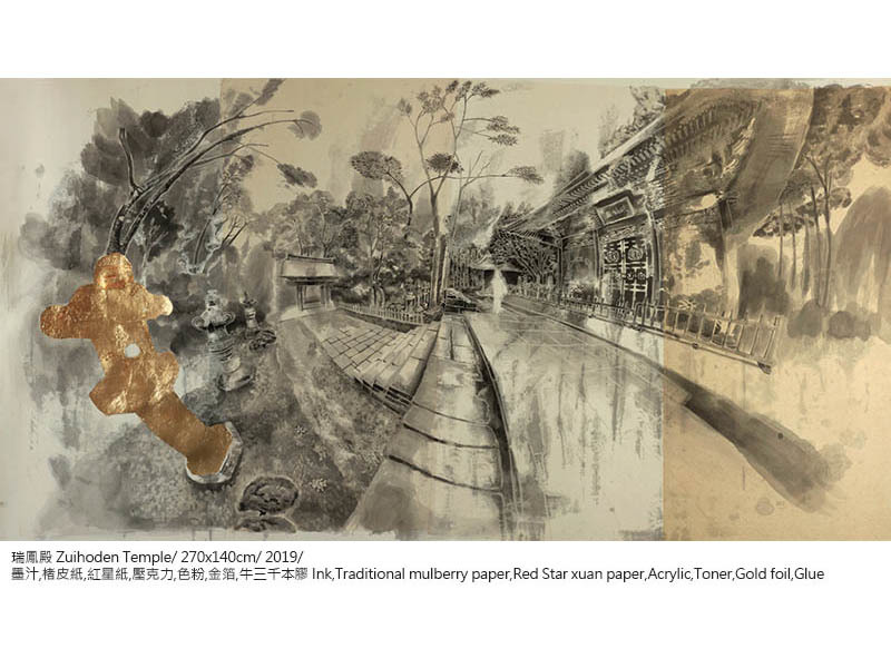 蔥蔥-黃琬玲個展黃琬玲成長於消費文化快速擴張的年代,人們藉由獨特的消費品味與活動,塑造自己的身分與認同。大學就讀於版畫組,以此現象為發想,創造以水墨為材質詮釋影像與版畫的方法,製作出具有負片效果的系列作品——《貢養人》,雜揉傳統水墨、流行符號語彙與鮮艷的顏料色彩,發展出獨特的創作語彙。2013年,工作室的一場大火,吞噬過往累積的一切,但也點燃了重新面對自己與自己對話的道路,創作轉向觀看自身,選擇以水印木刻的窄長卷畫創作《遊記》系列,對傳統材質與水墨有更深刻的掌握。《遊記》紀錄著生活的片段,將記憶集結為有敘事性的故事,其創作從圖像拓展至具敘事性的表現。 近期發展的《名所繪》系列以放射狀的透視點構成具有擴延性的視覺,向外擴散的構圖方式,形成沒有消失點的風景繪畫,以此呼應多點透視的文人繪畫,提出對風景繪畫的再思考。黃以膠描繪線條結構,再使用破碎、殘影、拓踏的方式,重新構築繪畫圖像與空間,混沌濕潤的筆觸與影像的層層堆疊,繪出一幅幅空氣、濕度流轉於紙上的場景。如同作品中展現的瞬息被畫筆勾勒成凝結的記憶,地景物件將隨著時間更迭嬗變,但在土地上孕育而生的文化卻能夠透過傳承而續存。 「蔥蔥」草木蒼翠茂盛的樣子,象徵著這片土地豐沛的生命能量以及爆發的文化狀態,也是黃琬玲腦海中靈感的縮影,美好而蓬勃。漫步在開放與直觀之間,不囿限於媒材的屬性與歷史,也不固著於技巧的雕琢,伴隨著自己的生命經驗,黃琬玲希望能劃開了一條路徑,探尋平面繪畫如何重新創造不可取代的生命力。 從制高處回望與前瞻——記黃琬玲靜宜個展Looking Back While Gazing Ahead From a High Vantage Point–HUANG Wanling Solo Art Exhibition Notes文\靜宜大學藝術中心主任 彭宇薰 by Yushun Elisa Pong, Director of Art Center, Providence University 必須冒險,注定叛逆,天生特立獨行——黃琬玲藝術創作之途,雖顛簸坎坷,卻始終如一。從二十幾歲初出道的《貢養人》水墨系列開始,她就以其獨特的「生猛氣質」昭告一己獨特的存在性;後來以風景為主題的《遊記》版畫系列,乃至最近的《名所繪》水墨系列,則可見其在生活、歲月的淬煉下,與藝術創作本身的自我對話,並披露其拓展格局與深化省思的發展軌跡。我們很高興在琬玲近四十而不惑之際,為她的藝術事業留下一個重要的見證。 As a rebel with a constant craving for adventure, Wanling Huang’s career in art may have been rough and bumpy, yet it has always remained consistent with her individualistic tendencies. Starting with her debut series of ink paintings titled, Gong Yang Ren, in her early twenties, she has been proclaiming her unique existence with a distinctly fierce temperament. Her later scenery-based print series, Traveing Notes, and more recent Meisho-E ink paintings serve as examples of her dialogue with art crystallized by life experience and the passing of time. The works also reveal traces of development in framework expansion and intense self-reflection. We are happy to bear witness to her artistic career as she approaches 40, an age without ambiguity. 生命能量的觀點來看,琬玲是一個強大的變動不居能量之承載體,她既具有敏銳的直覺性,也擁有極高的願景。由於其火能量非常旺盛,故早期的作品外向粗放,這種向上飛揚、盡情揮霍的年少青春,以及不多加修飾的「魯莽」直接性,終需要放慢沉澱,化為更富內聚力的曄然華光。這些年來,琬玲隨著生命能量的調整,遊走在版畫與水墨之間:版畫雖然耗時費工,然正好內斂其烈焰,收束其心志,但真正說來,她更需要一種處於制高點的宇宙性視野探勘與揮灑,因此具備高度自由性、一落筆即無可回顧的水墨創作,終究成為其理想的大格局作品之表現媒材。然而,大格局所需的深厚內涵,才是隨之而來必不可免的卓絕挑戰,這是琬玲生命必然要面對的另一波浴火鳳凰的戰鬥。 From the perspective of life, Wanling is a powerful conveyor of ever changing energy, employing a keen intuition along with an exceedingly grand vision. She has so much fiery passion that her earlier works can be considered exuberant and unrefined. This type of high-flying, audacious sense of youthfulness and unpolished, reckless straightforwardness all settle down eventually to transform into a cohesive brilliance. Over the years, Wanling has transitioned between print-making and ink painting as life energies realign themselves. Print-making is time-consuming and labor-intensive, but it is also the perfect tool to restrain her passion and rein in her aspirations. Realistically speaking, she needs a universal visual exploration and expression from a commanding vantage point. Thus, ink painting, which offers a high degree of freedom and the characteristic of “no going back” once the pen is engaged on paper, serves as the perfect medium for her ideal large-scale works. However, the solid inner qualities required by large-scale works are unavoidable challenges of excellence faced by Wanling in yet another wave in her crucible. 爰此,琬玲的社會關照從早先的次文化現象,轉向更為廣泛的多元文化比較與觀察。晚近以來,她在美國、韓國、日本等地的藝術駐村經驗,毫無疑問帶來了豐富的滋養,並刺激她對於本土的傳統文化,別有意識地再進一步思考與領會。琬玲宛若一位拓荒者,試圖潛入人類集體潛意識中,挖掘出殘渣或寶物,創意性地指向未來;她需要階段性地沈潛在直覺與理性思考中,消化她在世俗或神話世界裡,接收各種或可名、或不可名的訊息,並與自己強烈的